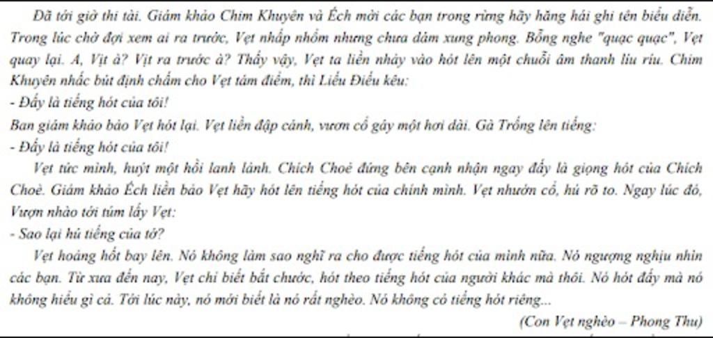 Câu 1 :Theo em , văn bản '' Con Vẹt nghèo '' thuộc thể loại gì ? đấu hiệu nào giúp em nhận biết được thể loại đó ?