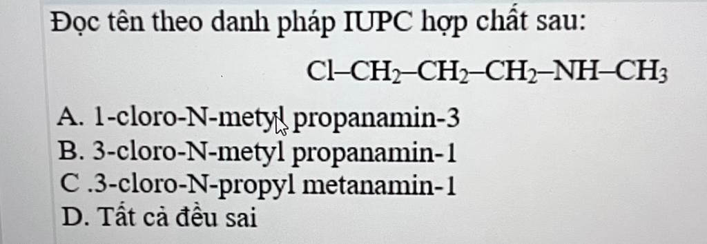 `->` Tên IUPAC là : $3-chloro-N-methylproane-1-amine$ hoặc $3-chloro-N-methylproanamine-1$