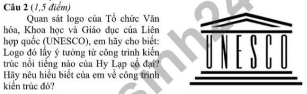 Câu 2 (1,5 điểm) Quan sát logo của Tổ chức Văn hóa, Khoa học và Giáo dục của Liên hợp quốc (UNESCO), em hãy cho biết: Logo đó lấy ý tưởng từ công trình kiến trúc nổi tiếng nào của Hy Lạp cổ đại? Hãy nêu hiểu biết của em về công trình kiến trúc đó?