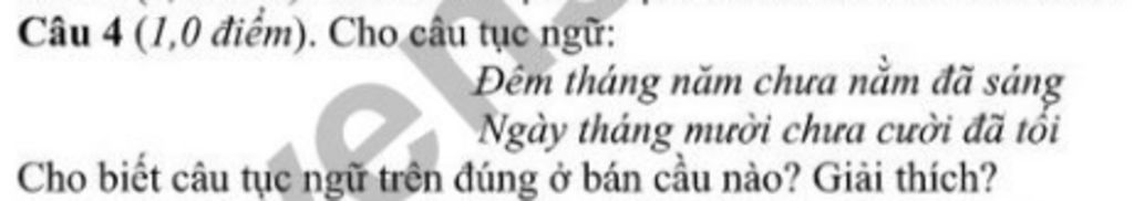 Trả lời: Đúng ở bán cầu bắc Giải thích: Câu tục ngữ này thể hiện sự khác biệt về thời gian giữa hai bán cầu trái đất.Bán cầu Bắc nằm ở bán cầu phía Bắc,trong đó tháng năm đề cập đến mùa đông,khi ngày dài và đêm ngắn.Do đó,dù là đêm tháng năm nhưng vẫn có thể sáng sớm .Ngược lại,ngày tháng mười đề cập đến mùa hè ,khi ngày dài và đêm ngắn .Vì vậy dù là ngày tháng mười nhưng có thể tối sớm. CHO TUI 5 SAO nha