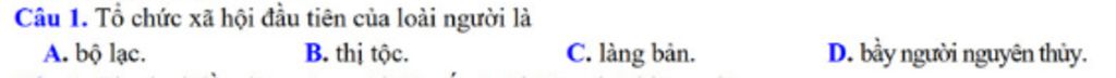 Câu 1. Tổ chức xã hội đầu tiên của loài người là