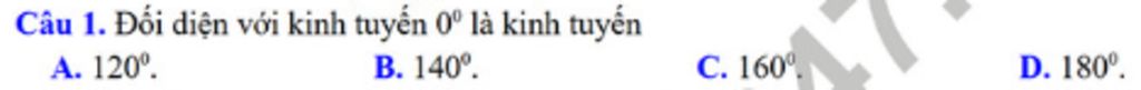 Câu `1` : Đối diện với kinh tuyến `0^0` là kinh tuyến `180^0`