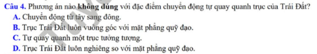 Câu 4. Phương án nào không đúng với đặc điểm chuyển động tự quay quanh trục của Trái Đất?B. Trục Trái Đất luôn vuông góc với mặt phẳng quỹ đạo.
