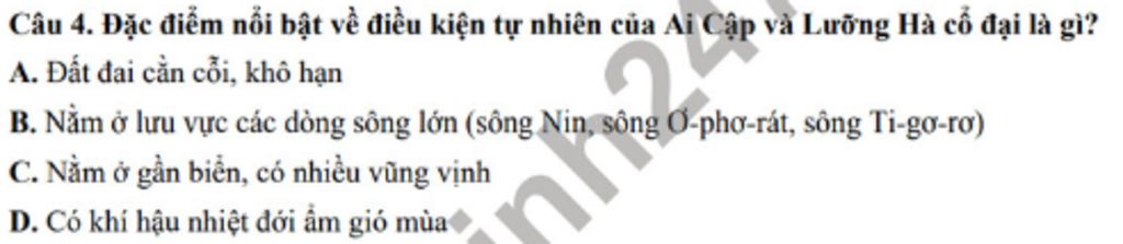 Câu 4. Đặc điểm nổi bật về điều kiện tự nhiên của Ai Cập và Lưỡng Hà cổ đại là gì?