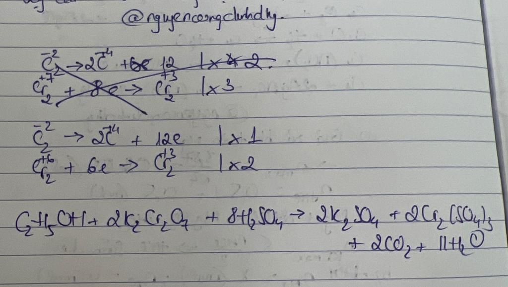 $\mathop{C}\limits^{-3}H_3\mathop{C}\limits^{-1}H_2OH+K_2\mathop{Cr_2}\limits^{+6}O_7+H_2SO_4 \to K_2SO_4+\mathop{C}\limits^{+4}O_2+\mathop{Cr_2}\limits^{+3}(SO_4)_3+H_2O$