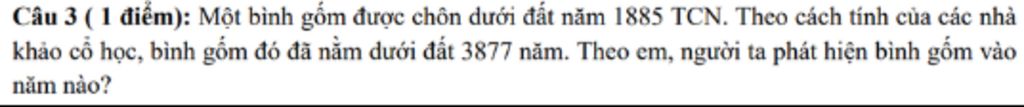 Câu 3 (1 điểm): Một bình gốm được chôn dưới đất năm 1885 TCN. Theo cách tính của các nhà khảo cổ học, bình gốm đó đã nằm dưới đất 3877 năm. Theo em, người ta phát hiện bình gốm vào năm nào