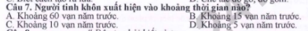 Câu 7. Người tinh khôn xuất hiện vào khoảng thời gian nào?