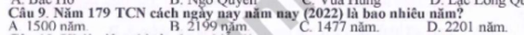 Câu 9. Năm 179 TCN cách ngày này năm nay (2022) là bao nhiêu năm?