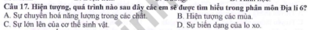 Câu 17. Hiện tượng, quá trình nào sau đây các em sẽ được tìm hiểu trong phân môn Địa lí 6?