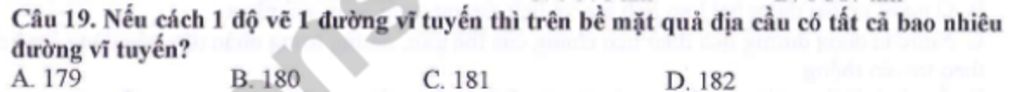 Câu 19. Nếu cách 1 độ vẽ 1 đường vĩ tuyến thì trên bề mặt quả địa cầu có tất cả bao nhiêu đường vĩ tuyến?