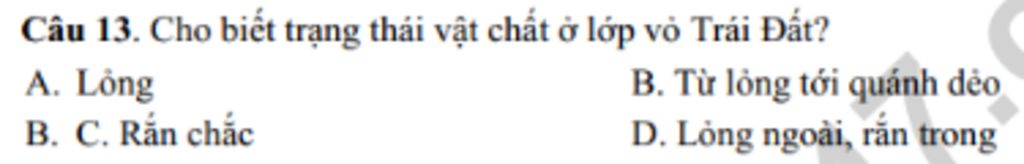Câu 13. Cho biết trạng thái vật chất ở lớp vỏ Trái Đất?