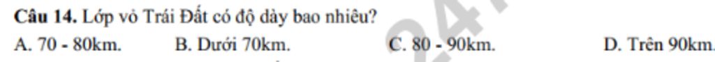 `***` Lớp vỏ Trái Đất có độ dày dưới `70km(5km-70km)`