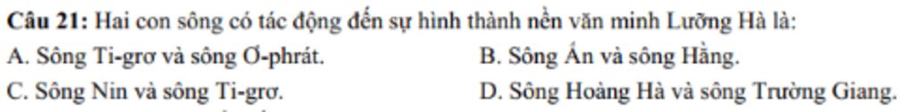 Câu 21: Hai con sông có tác động đến sự hình thành nền văn minh Lưỡng Hà là: