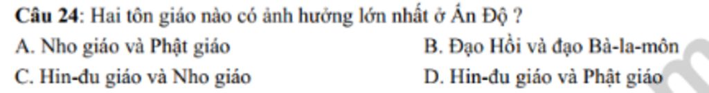 Câu 24: Hai tôn giáo nào có ảnh hưởng lớn nhất ở Ấn Độ ?
