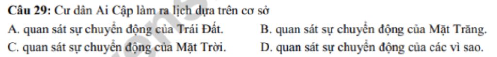 Câu 29: Cư dân Ai Cập làm ra lịch dựa trên cơ sở