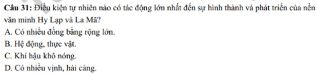 Câu 31: Điều kiện tự nhiên nào có tác động lớn nhất đến sự hình thành và phát triển của nền văn minh Hy Lạp và La Mã?