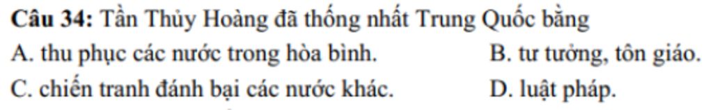Câu 34: Tần Thủy Hoàng đã thống nhất Trung Quốc bằng