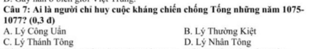 → Lý Thường Kiệt là người chỉ huy cuộc kháng chiến chống Tống những năm 1075 - 1077