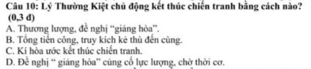 Câu 10: Lý Thường Kiệt chủ động kết thúc chiến tranh bằng cách nào? (0,3 d)