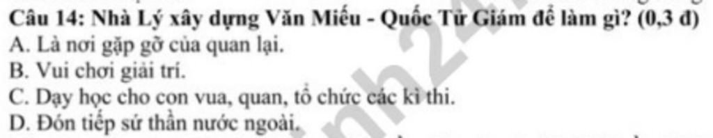 Câu 14: Nhà Lý xây dựng Văn Miếu - Quốc Tử Giám để làm gì? (0,3 đ)
