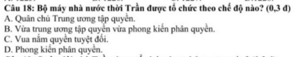 Câu 18: Bộ máy nhà nước thời Trần được tổ chức theo chế độ nào? (0,3 đ)