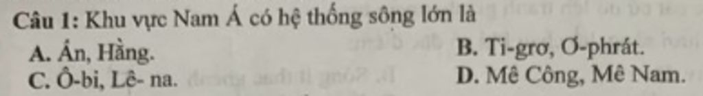 Câu 1: Khu vực Nam Á có hệ thống sông lớn là A. Ấn, Hằng. B . Ti-gro, O-phrát. C. Ô-bi, Lê-na.