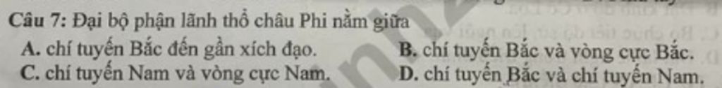Câu 7: Đại bộ phận lãnh thổ châu Phi nằm giữa