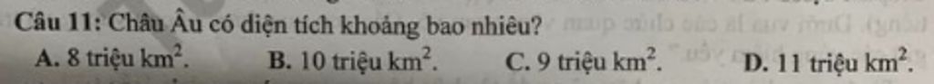 Câu 11: Châu Âu có diện tích khoảng bao nhiêu?