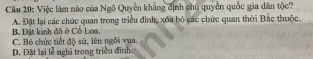 Câu `20` : Việc làm nào của Ngô Quyền khẳng định chủ quyền quốc gia dân tộc?