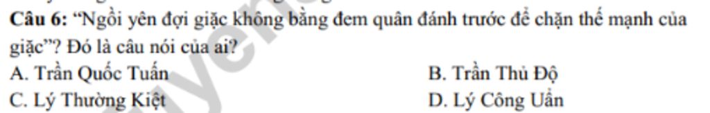 Câu 6: “Ngồi yên đợi giặc không bằng đem quân đánh trước để chặn thế mạnh của giặc”? Đó là câu nói của ai?