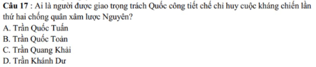 Câu 17 : Ai là người được giao trọng trách Quốc công tiết chế chỉ huy cuộc kháng chiến lần thứ hai chống quân xâm lược Nguyên?