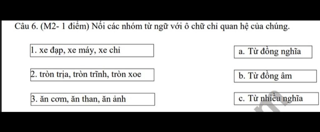 Câu 6. (M2- 1 điểm) Nối các nhóm từ ngữ với ô chữ chỉ quan hệ của chúng.