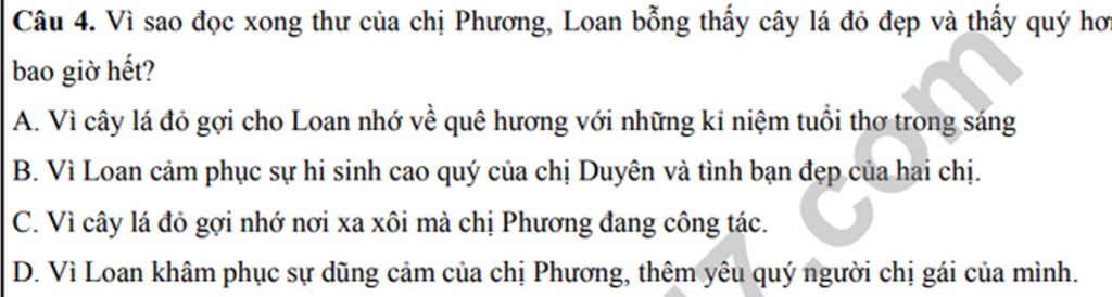 `-` Sau khi đọc thư của chị Phương, Loan cảm thấy cây lá đỏ đẹp và quý hơn bao giờ hết vì nó gợi nhớ đến tình bạn đẹp đẽ giữa chị Phương và chị Duyên, và sự hi sinh cao quý của chị Duyên.