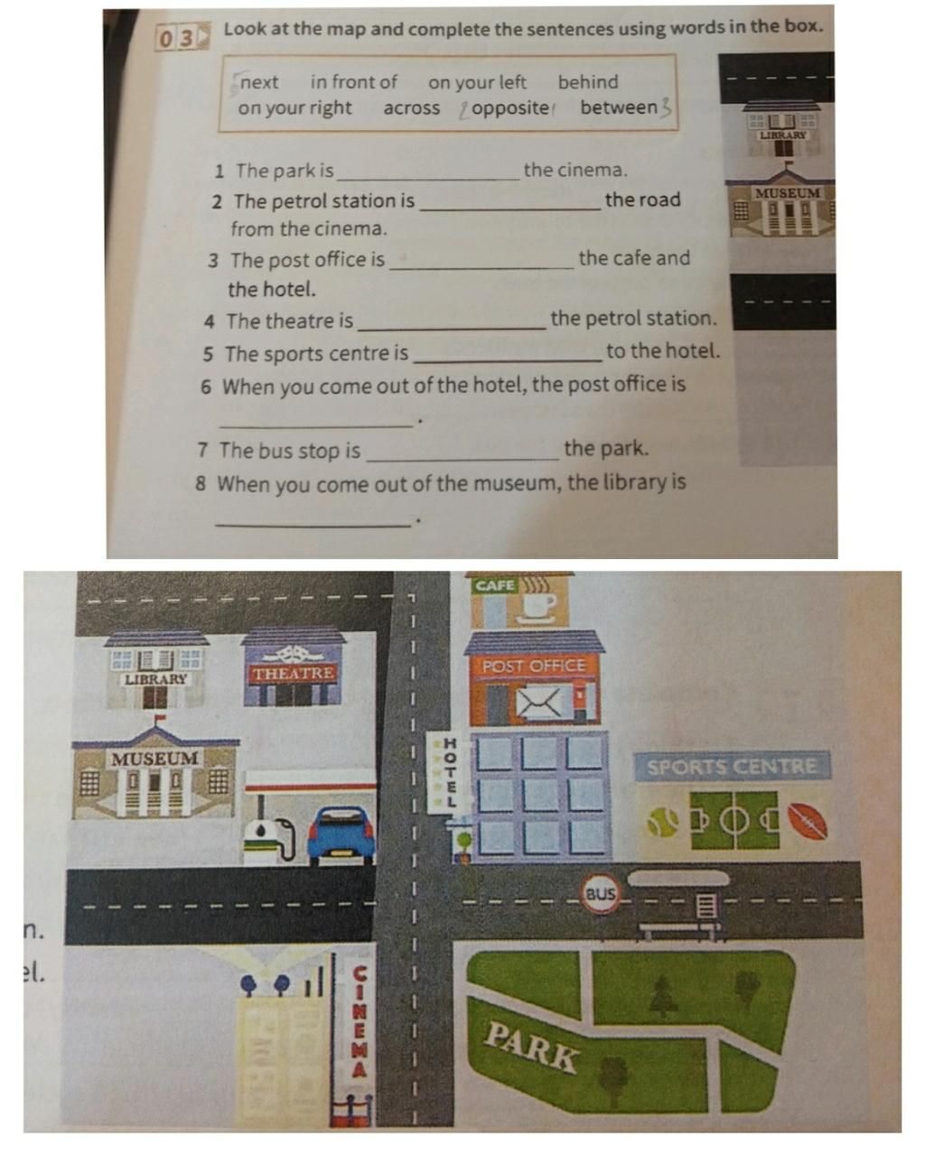 3 The post office is between the cafe and the hotel