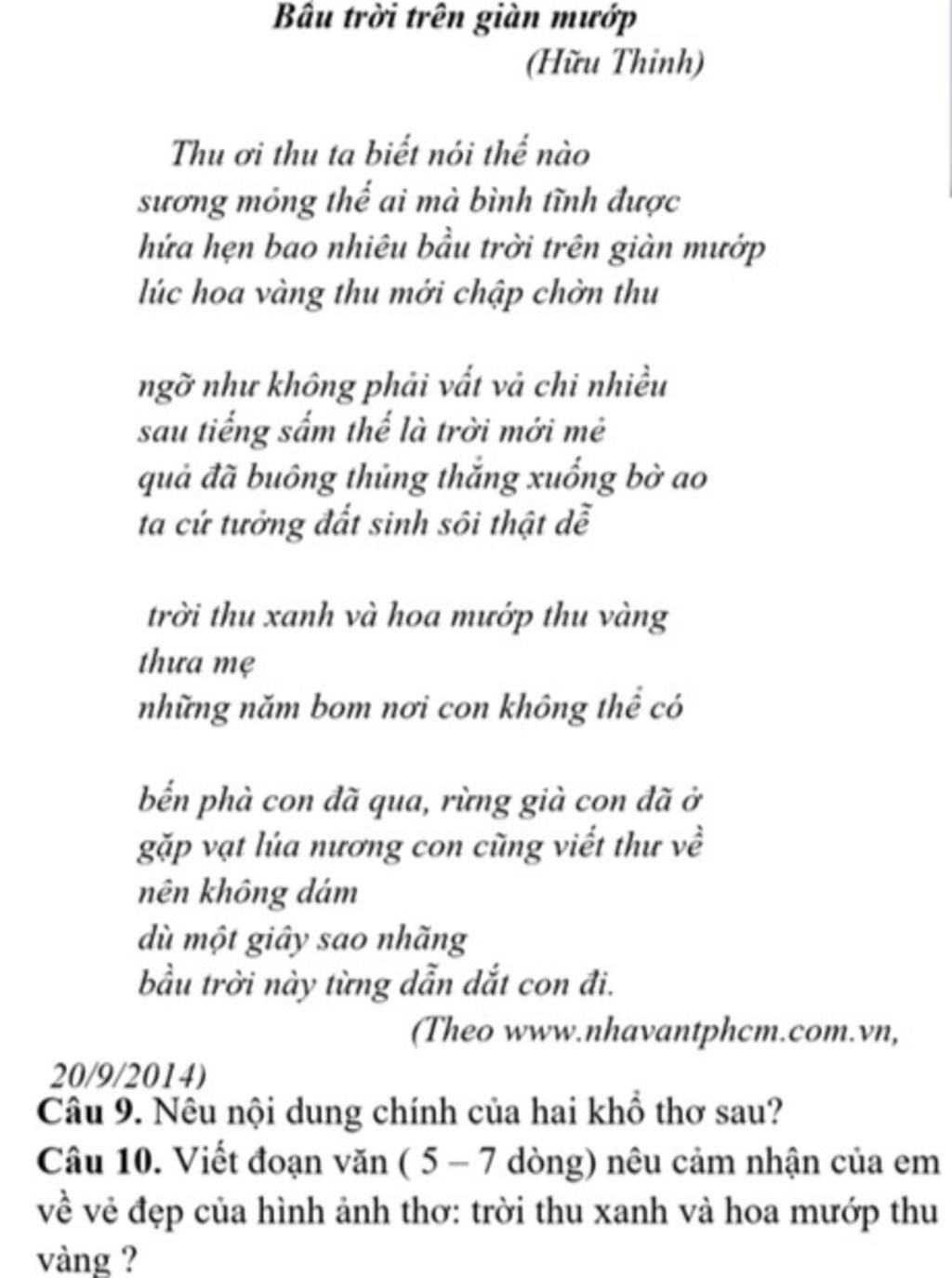 Câu 10: "Trời thu xanh" và "hoa mướp vàng" là hai hình ảnh thơ mang trong đó sự hòa hợp giữa các sắc thái. Cái sắc xanh của trời thu hoà quyện với cái sắc vàng của mượp dường như đã làm nên một bức tranh phong cảnh vô cùng hài hoà và bắt mắt. Đồng thời qua đó gợi mở được cái không gian khoáng đãng, cao rộng của trời đời, ánh lên được cái sự thanh bình, giản dỉ, mộc mạc mà trần ấm trong tâm hồn của thi nhân.