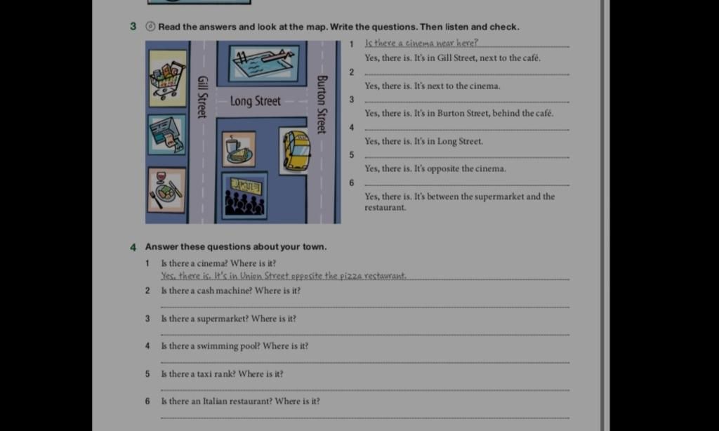 3 Read the answers and look at the map. Write the questions. Then listen and check.