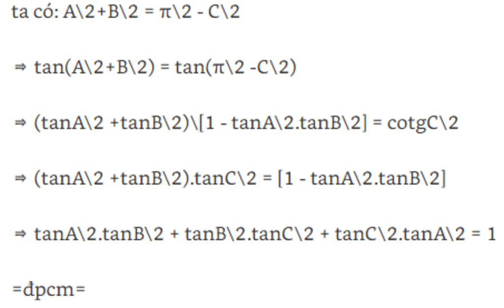 vay tan A/2tanB/2 +tanA/2tanC/2+ tan B/2tanC/2=1--tanB/2tanC/2+tanB/2tanC/2=1