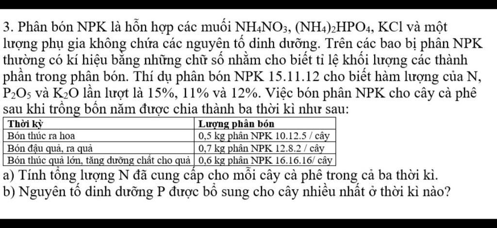 `=>` Tổng lượng M cung cấp cho mỗi cây cà phê cả ba thời kì :
