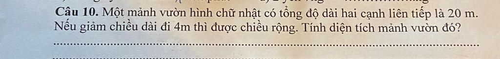 ⇒ Tổng chiều dài và chiều rộng của mảnh vườn hình chữ nhật đó là : `20` `m`