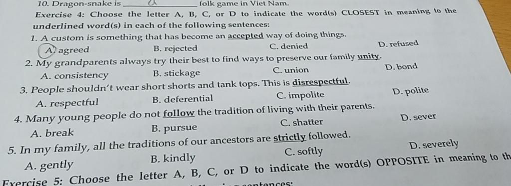 Exercise 4: Choose the letter A, B, C, or D to indicate the word(s) CLOSEST in meaning to the