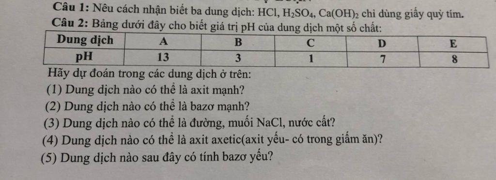 (1) Axit mạnh có thể là C do có pH<7 và pH càng thấp thì tính axit càng mạnh