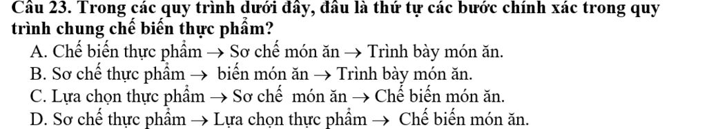 Câu 23. Trong các quy trình dưới đây, đâu là thứ tự các bước chính xác trong quy trình chung chế biến thực phẩm?