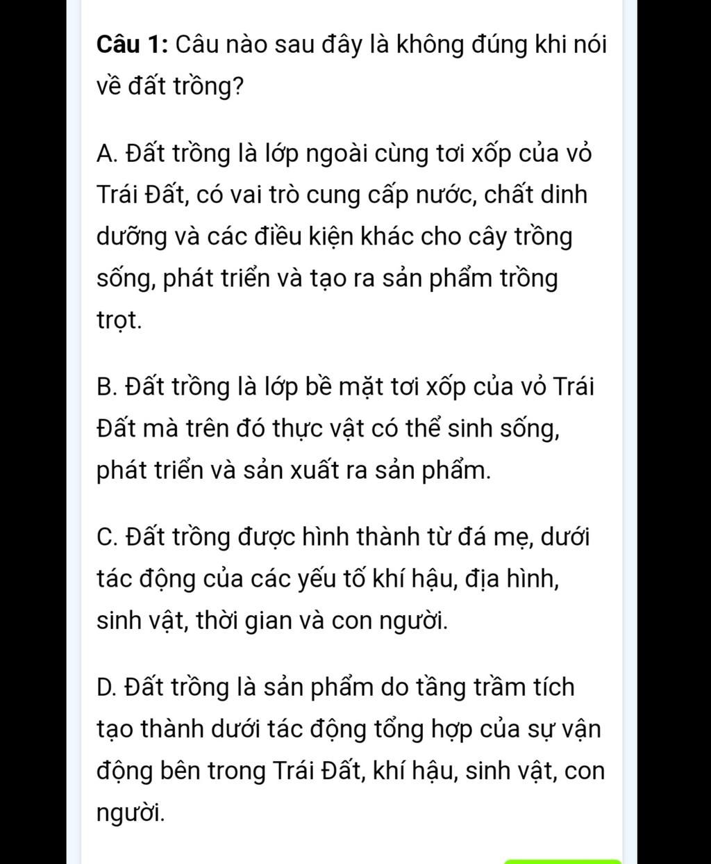 A. Đất trồng là lớp ngoài cùng tơi xốp của vỏ