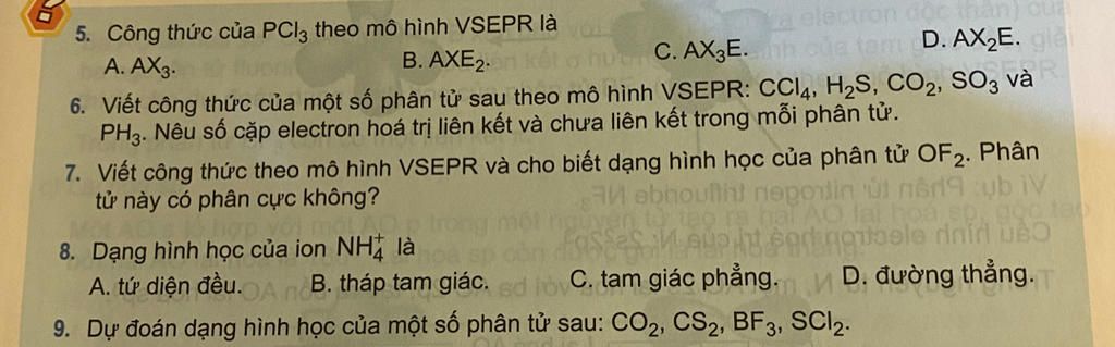 PH3. Nêu số cặp electron hoá trị liên kết và chưa liên kết trong mỗi phân tử.