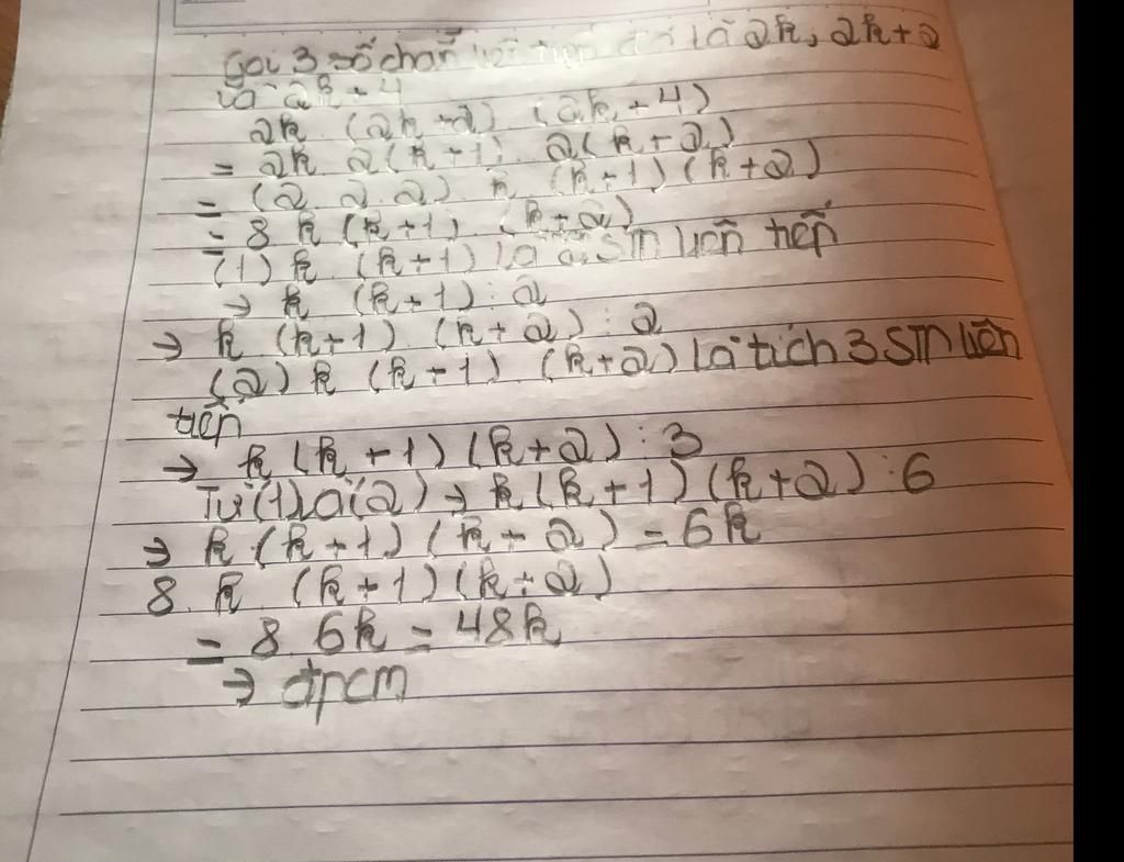 Gọi 3 số chẵn liên tiếp là 2k,2k+2,2k+4 Ta có: 2k.(2k+2).(2k+4)=2k.2(k+1).2(k+2) =8.k(k+1).(k+2) Vì k(k+1) là tích 2 số tự nhiên liên tiếp=>k(k+1) chia hết cho 2 Vì k(k+1)(k+2) là tích 3 số tự nhiên liên tiếp=>k(k+1)(k+2) chia hết cho 3 =>k(k+1)(k+2) chia hết cho 6,mà 8 chia hết cho 8 =>8.k(k+1)(k+2) chia hết cho 48