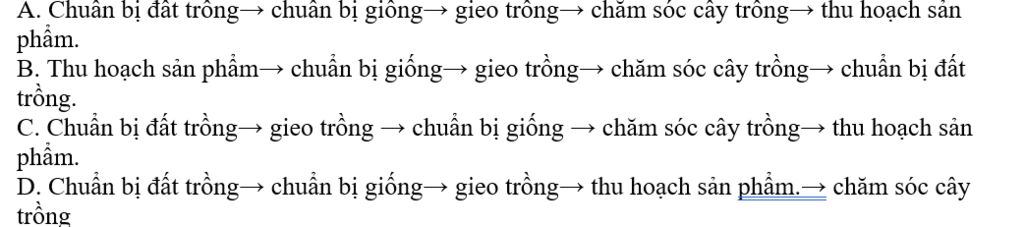 `⇒` `A.` Chuẩn bị đất trồng `→` chuẩn bị giống `→` gieo trồng `→` chăm sóc cây trồng `→` thu hoạch sản phẩm`.`