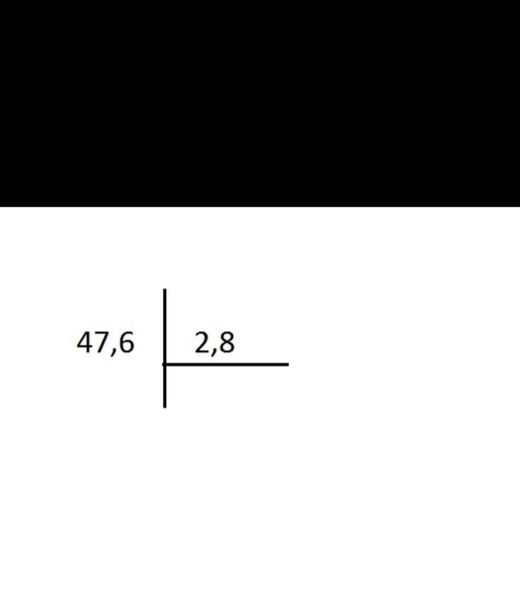 `47,6` `|` `2,8` `text{Vậy 47,6 : 2,8 = 17}`