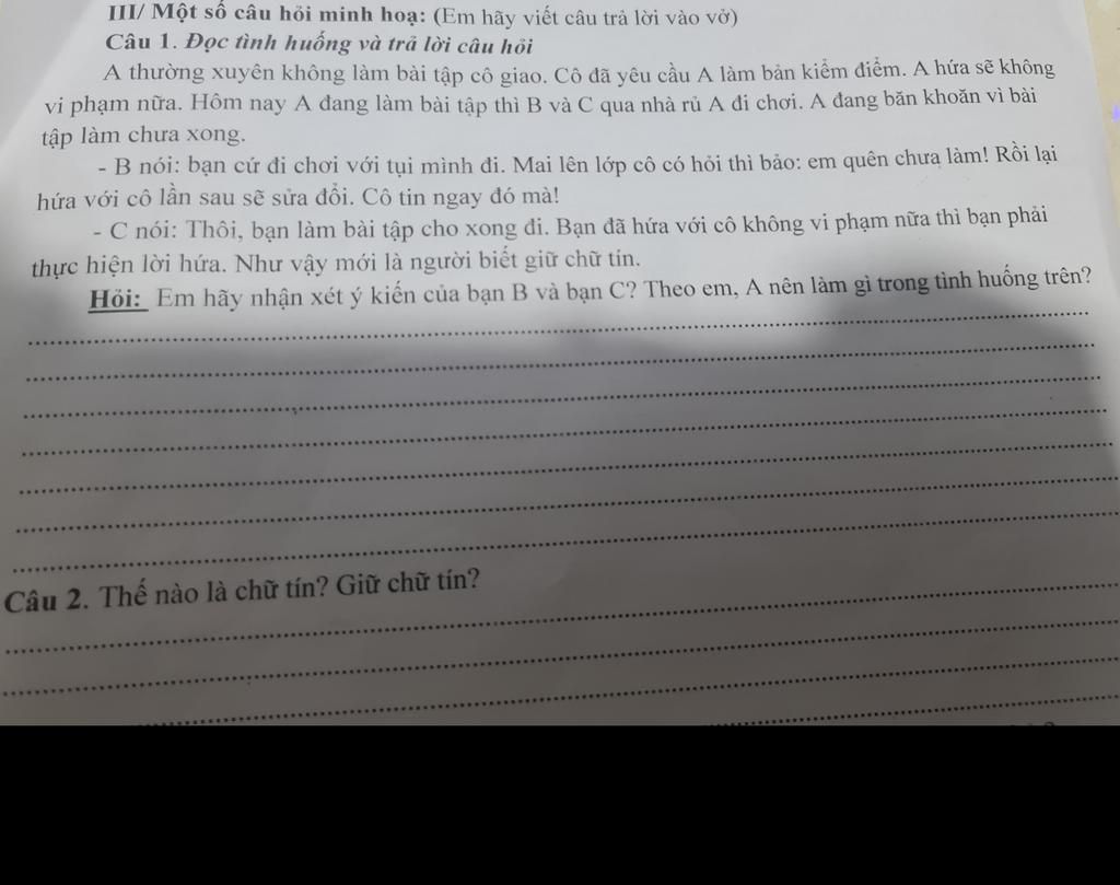 A thường xuyên không làm bài tập cô giao. Cô đã yêu cầu A làm bản kiểm điểm. A hứa sẽ không vi phạm nữa. Hôm nay A đang làm bài tập thì B và C qua nhà rủ A đi chơi. A đang băn khoăn vì bài tập làm chưa xong.