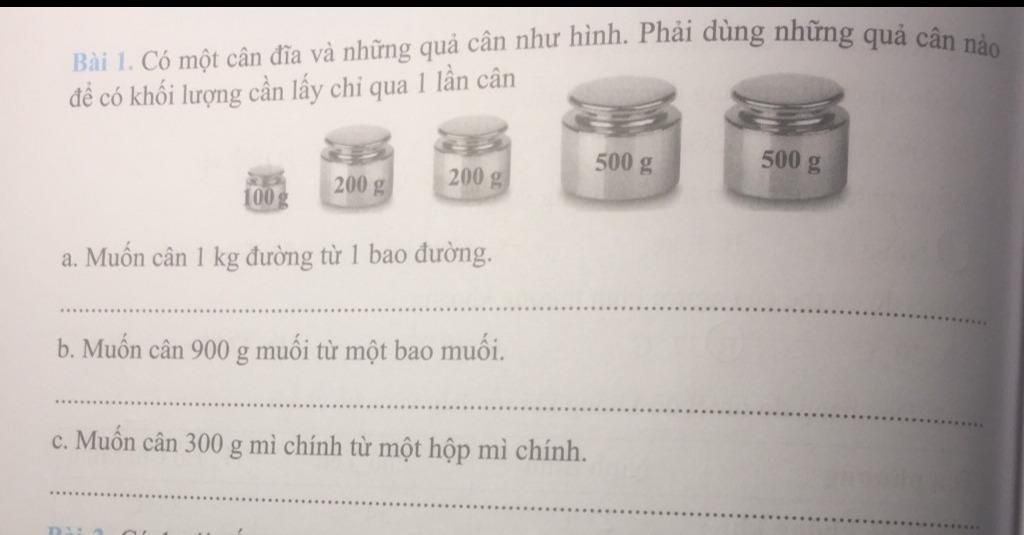 Giải thích các bước giải:a, lấy 2 quả cân 500gam hoặc lấy 2 quả cân 200g và 1 gủa cân 100g và 1 quả cân 500g đều để lên 1 đĩa