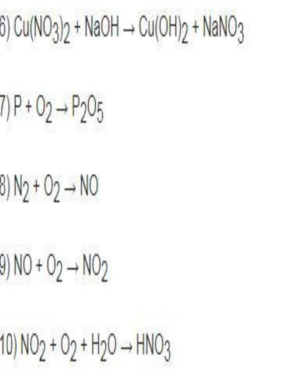 `10) 4NO_2 + O_2 + 2H_2O → 4HNO_3`